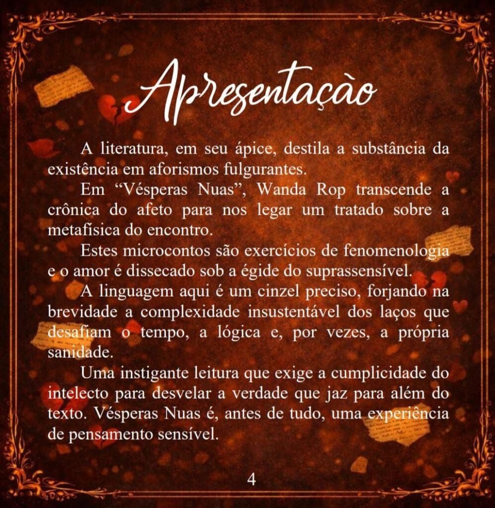 A literatura contemporânea, por vezes fustigada pela superficialidade, encontra um solo de resistência intelectual e sofisticação estética em Vésperas Nuas, o mais recente lançamento de Wanda Rop 🌹.