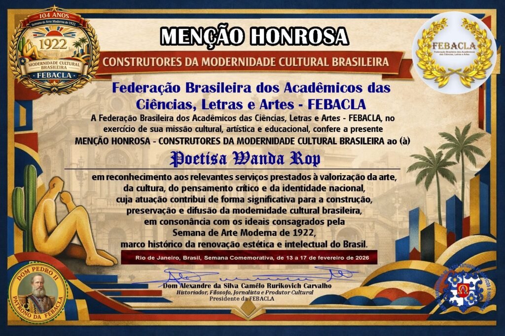 Recebo, com profunda honra e serena gratidão, a Menção Honrosa “Construtores da Modernidade Cultural Brasileira”, concedida pela Federação Brasileira dos Acadêmicos das Ciências, Letras e Artes (FEBACLA), durante a Semana Comemorativa realizada no Rio de Janeiro, de 13 a 17 de fevereiro de 2026, em reverência aos ideais da histórica Semana de Arte Moderna de 1922. ✨