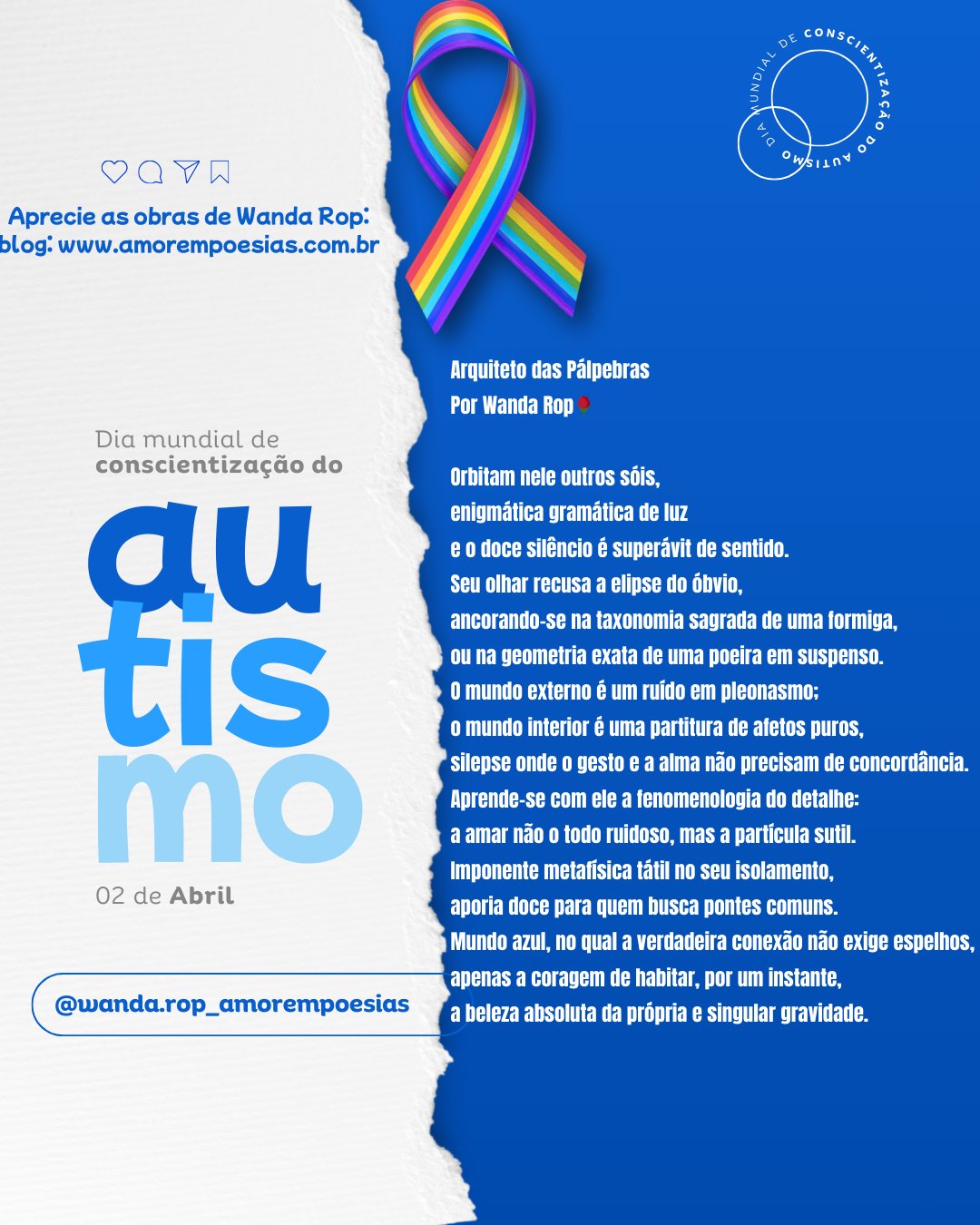 ✨ Arquiteto das Pálpebras: Uma ode à beleza do “mundo azul”. Um olhar fenomenológico sobre o autismo, onde o detalhe é o absoluto e o silêncio é superávit de sentido. Aqui, a conexão não exige espelhos, apenas a coragem de habitar uma gravidade singular.