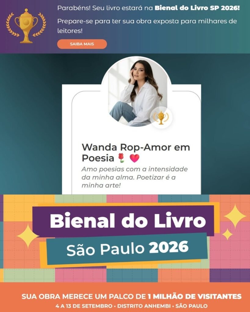 ✨ É oficial! Com muita alegria e o coração transbordando poesia, confirmamos que as obras de Wanda Rop estarão brilhando na Bienal do Livro de São Paulo 2026! ✨